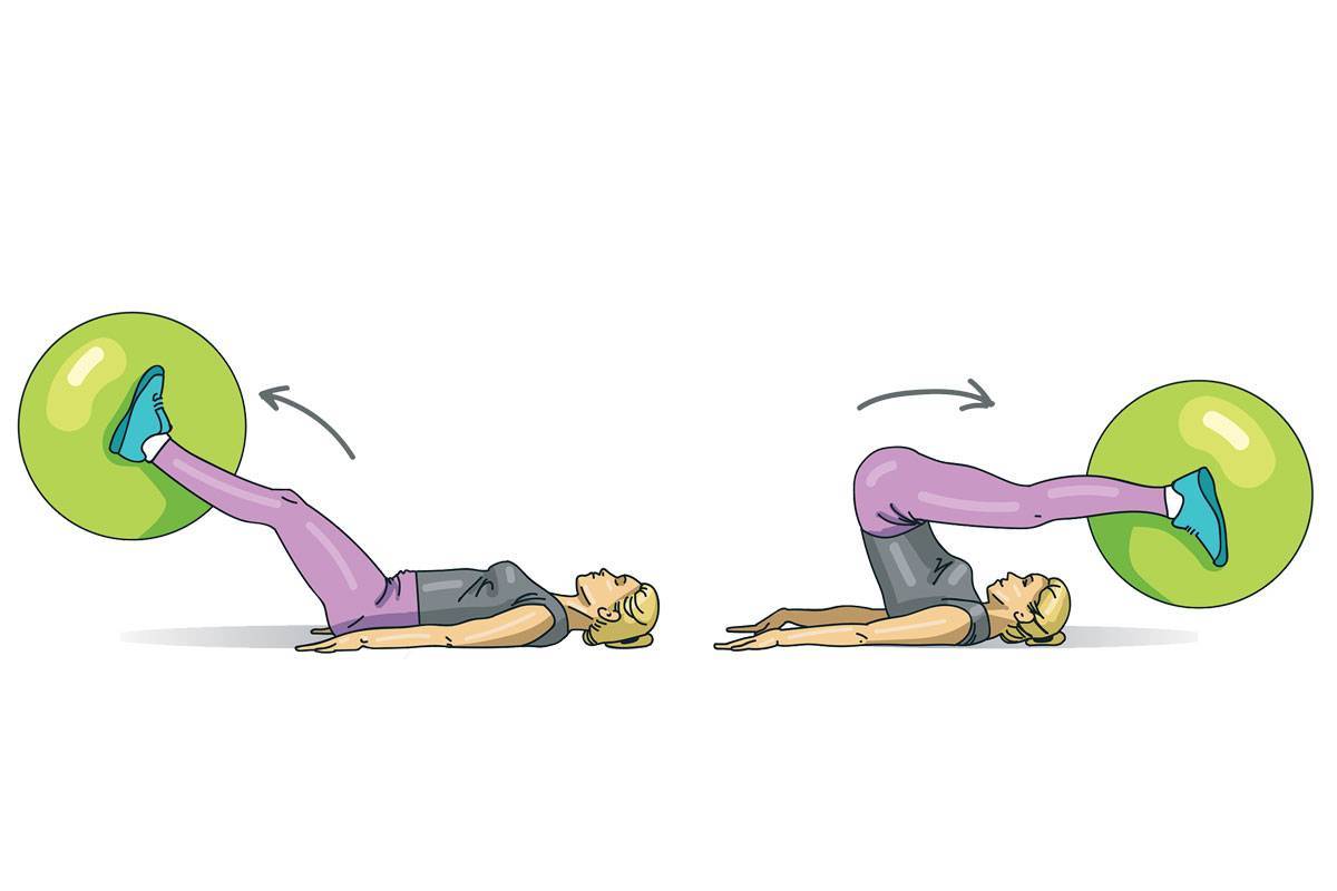 Исходное положение — лежа на спине на полу, руки вытянуты вдоль тела, одна нога на фитболе, другая согнута в колене и поднята вверх. За счет активации мышц пресса и ягодиц медленно подкатите мяч к себе, затем вернитесь в исходное положение и перемените ногу.