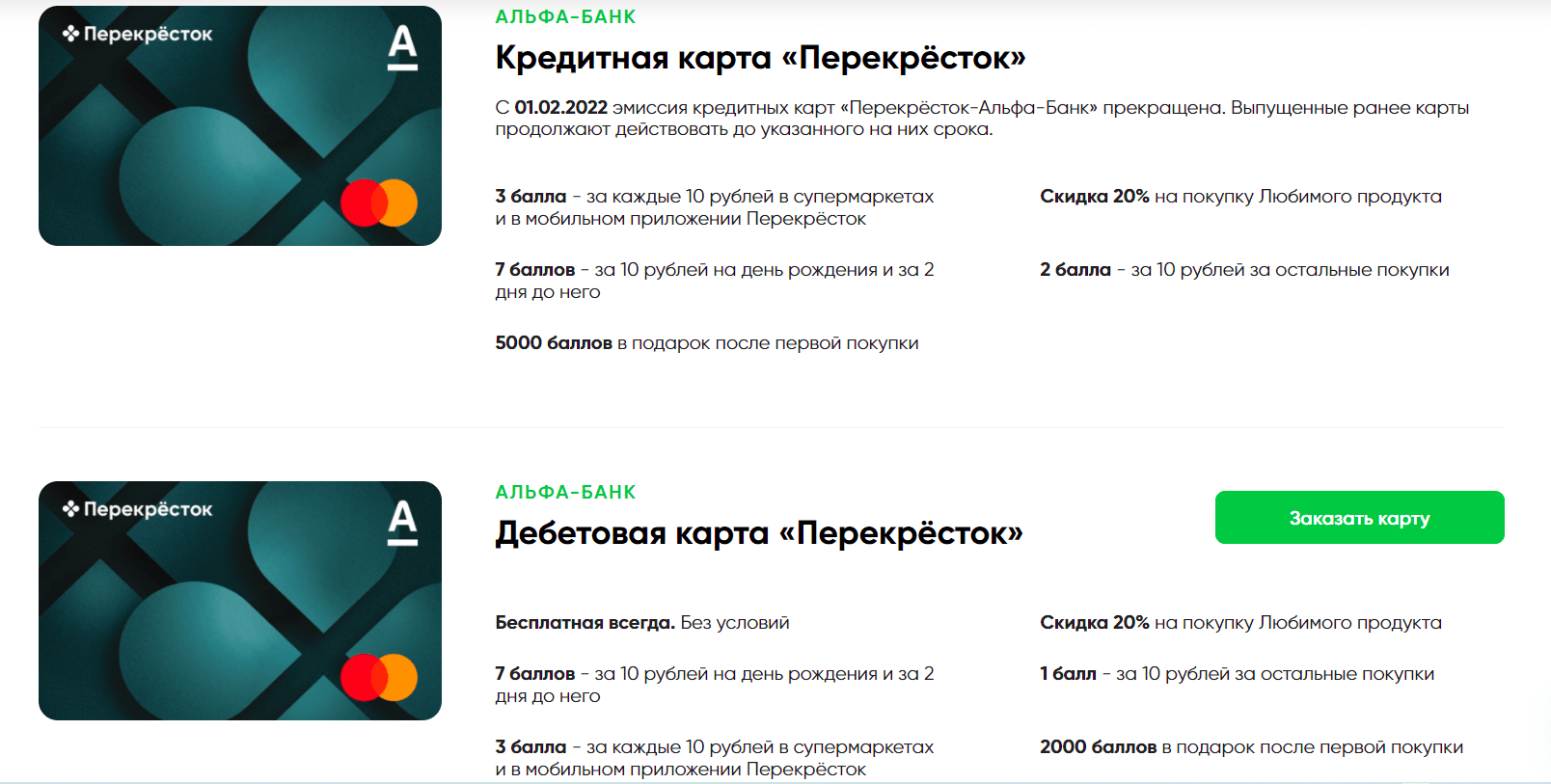 - Перекресток Альфа-Банка – 2000 баллов в подарок, 1-3 балла за каждые 10 потраченных рублей и 20% скидка в сети магазинов;