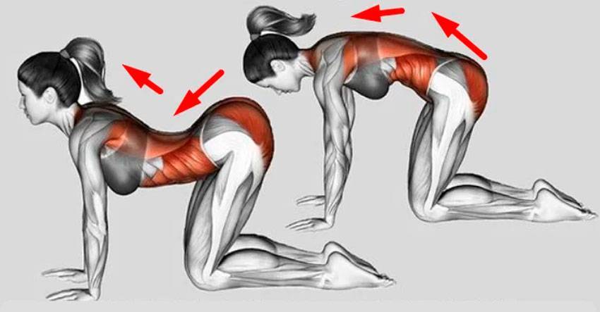 - На вдохе начинайте движение от копчика, сожмите мышцы ягодиц и направьте таз вперед, далее постепенно начинай округлять спину, чувствуя, как растягивается позвоночник, а мышцы живота сжимаются и напрягаются, подтягивая живот к позвоночнику.. Максимально прогнитесь, опустив голову вниз. На выдохе медленно примите исходное положение.