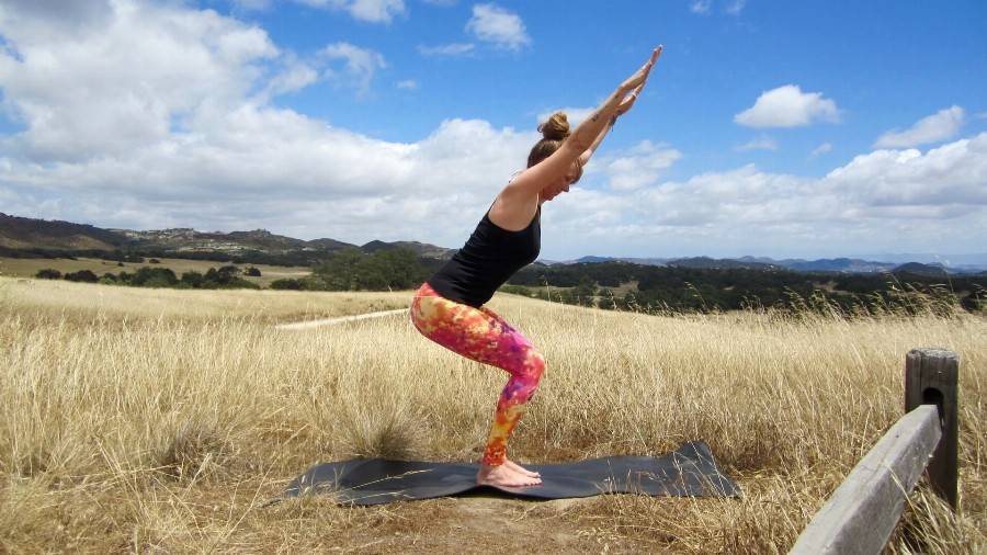 Хорошенько размявшись сидя, переходим к асанам из положения стоя. Одна из несложных, но очень полезных поз — это поза Стула, она же Уткатасана (см. видео).