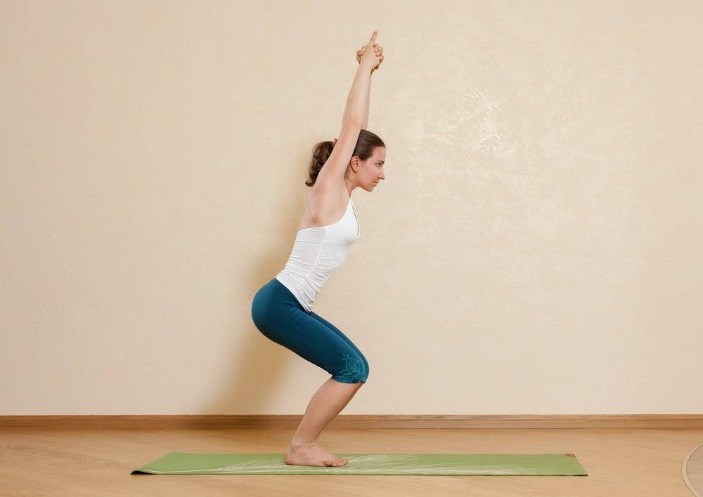 Выполните асану согласно инструкции, указанной выше. Когда вы согнете колени, поднимитесь на плюсны стоп и выполняйте асану не опуская пятки в пол.
