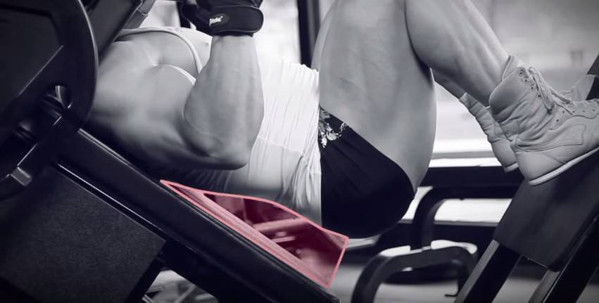 Высокая постановка ног на платформе — делает акцент на бицепсы бедер и ягодицы, см. ниже фото: