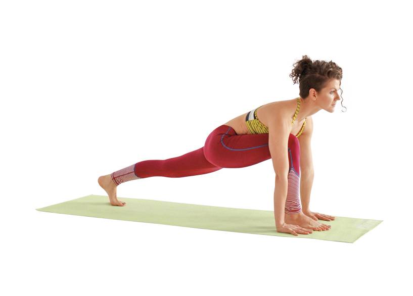 - Восемь пунктов (углубленный выдох) Чатуранга Дандасана. Медленно опуститесь на коврик, коснувшись его восемью точками вашего тела: ногами, коленями, руками, грудью, лбом. Ягодицы, бедра и живот поднимите вверх. Пальцы ног подожмите. Продержитесь так всего одну минуту, затем задержите дыхание, и опускайте тело в направлении земли.