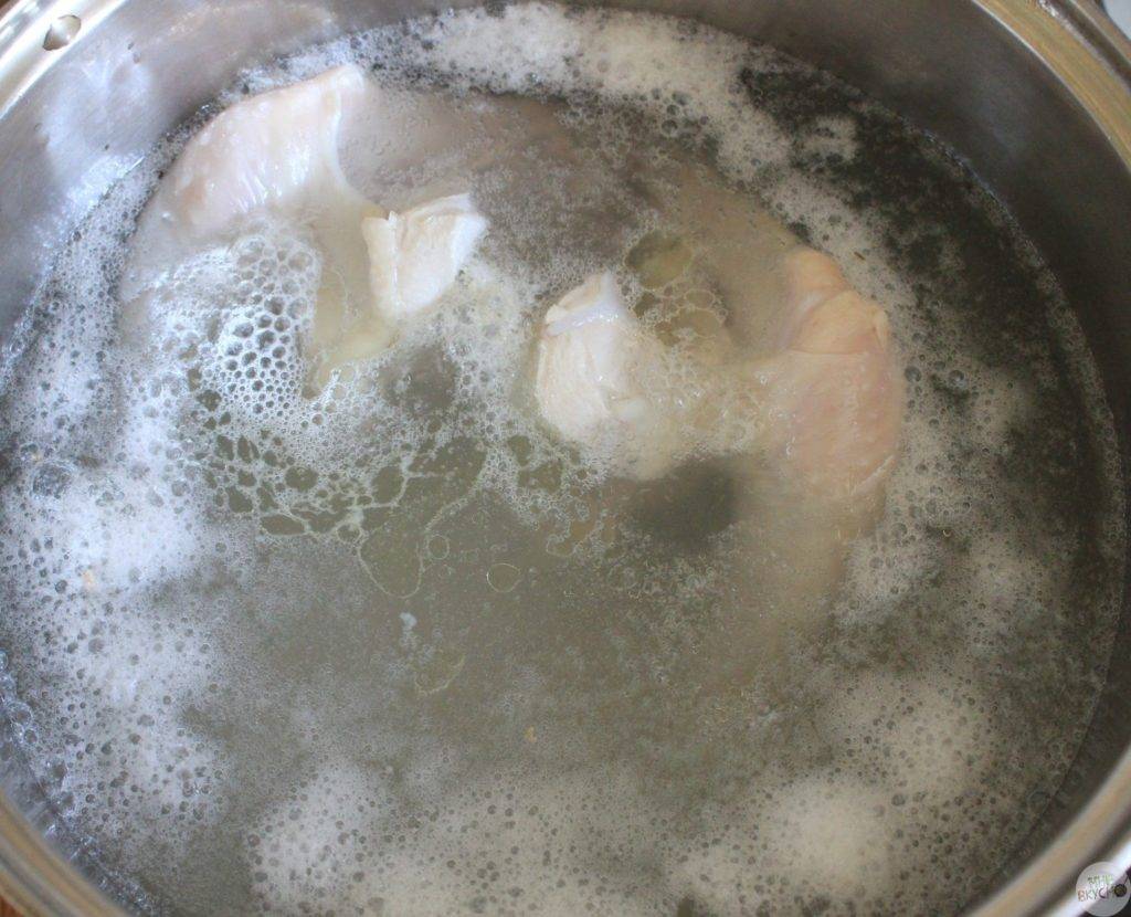- В первую очередь, грудинку следует промыть, удалить с нее кожу и разрезать на две части. На этот рецепт уйдет половина одной куриной грудки. Выбранную часть замочить на некоторое время, чтобы вышли ненужные вещества, как уже было отмечено выше. Затем грудку положить в кастрюлю, залить холодной водой и поставить на огонь. Пока вода закипает, очистить овощи.