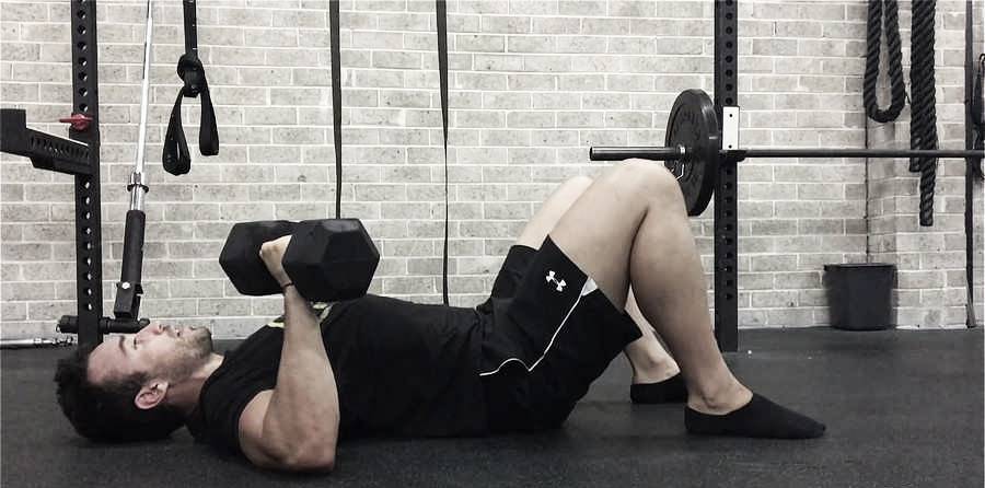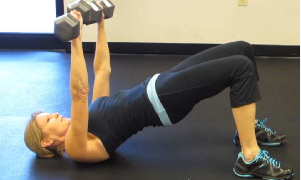 - Поднимите таз и бедра до образования прямой линии и выжмите гантели вверх.