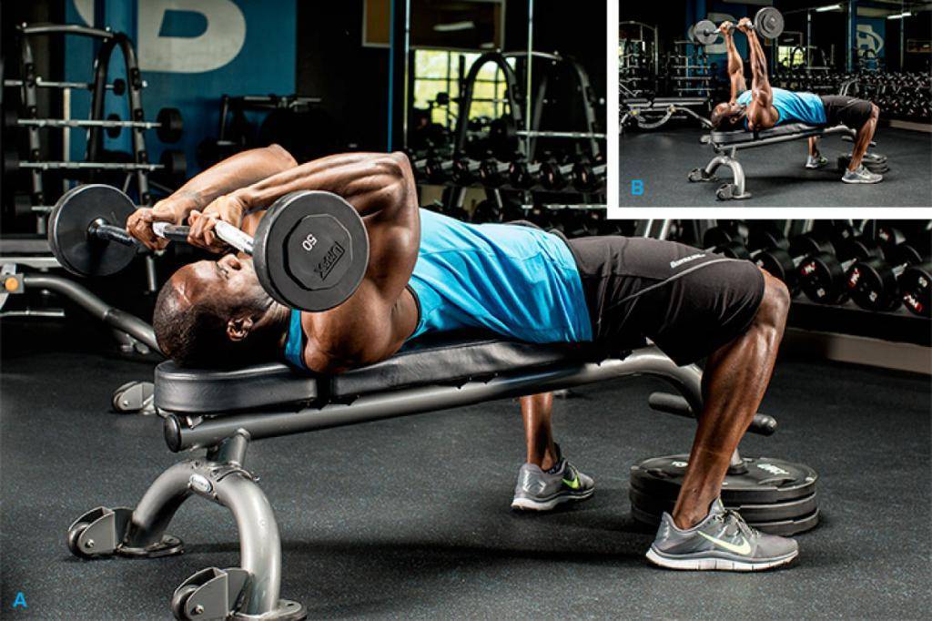 Выполнение: Находясь в основном положении лежа на скамье с плотно сведенными лопатками, прогнувшись в грудном отделе позвоночника подняв гантели над собой на вытянутые руки, ладонями находятся в пронированном положении. И после того как руки с гантелями приняли устойчивое положение, равномерно и плавно опускаем гантели до уровня верхней части груди. Примерно до того же уровня, на который вы опускаете штангу. Опускание происходит в течение 2-3 секунд на вдохе. После того как гантели достигли нижнего уровня, начинаем плавно в течение 2-3 секунд на выдохе поднимать их вверх.