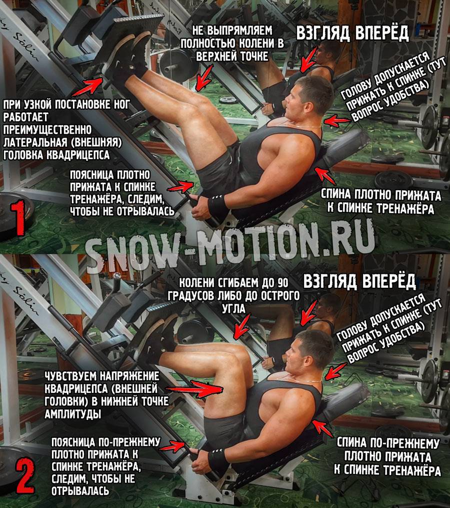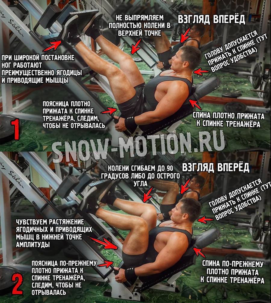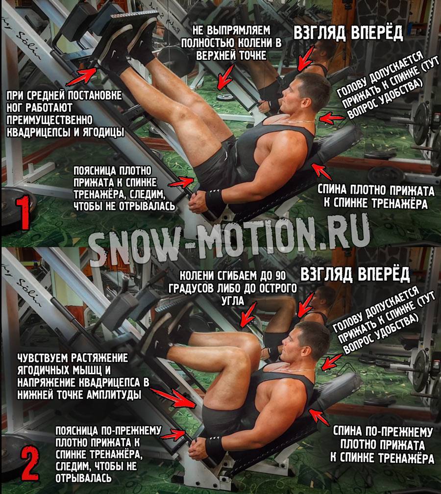 Обычно чем выше угол у этого тренажера, тем он тяжелее. Ноги лучше ставить ближе к верхнему краю платформы. В таком случае меньше вероятность, что вы будете отрывать таз от лавки. А это может травмировать вашу спину. Ширину постановки ног можно варьировать. Основные фишки1. Это упражнение отлично подойдёт тем, у кого проблемы со спиной. Так как здесь нет осевой нагрузки на позвоночник и спина выключена из работы.2. Чем шире поставите ноги и разведёте колени в стороны, тем больше нагрузка ляжет на внутреннюю часть бедра. Чем уже ноги и колени, тем больше будет работать четырёхглавая мышца (передняя поверхность бедра).3. Чем ниже будете опускать платформу, тем больше будут работать ягодицы. Однако не переусердствуйте. В нижней точке таз не должен отрываться от опоры. Можно травмировать поясницу.4. Как вариант можно жать одной ногой. Нога в таком случае ставится чуть в стороне от центра платформы. А нагрузка больше идёт на внутреннюю поверхность бедра. Но новичкам такой вариант не советую.5. Так же можно попробовать не выпрямлять ноги до конца. Так ваши мышцы сильнее и быстрее забьются.6. Чем выше на платформе вы поставите ноги, тем больше будут грузиться ягодицы. А чем ниже – бёдра.7. Вообще, это упражнение является базовым. Но не советую им заменять приседания со штангой. Это оправдано только в том случае, если в силу травм вы не можете приседать.