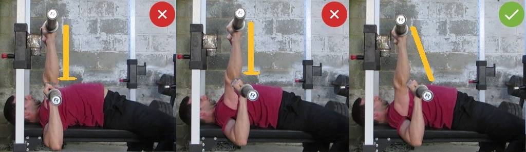 Не вертикальная траектория. В отличии от приседа и становой тяги, вертикальная траектория движения штанги не работает и не приветствуется в жиме лежа. Если вы поднимаете штангу строго вертикально это заставляет ваши локти разводиться на 90. Это травмирует плечи и усложняет выполнение упражнения. Самый безопасный и эффективные способы сделать жим лежа — соблюдать диагональную траекторию положения над плечами до середины груди и обратно.